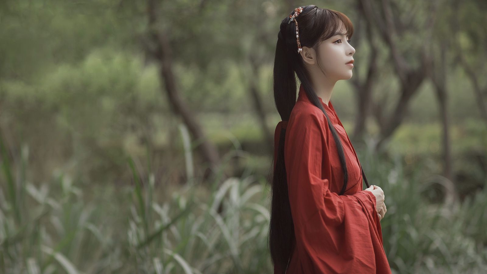 身上是鲜红色的银丝边罗裙,内里是半透明的白色纱衣。