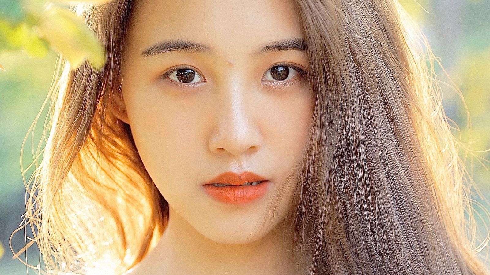 未施粉黛的鹅蛋脸白嫩细腻,墨发过肩饱满的额头前是碎碎的空气刘海,内扣的发型遮住一小半的耳朵,微红脸颊满满的胶原蛋白,红唇薄嫩诱人,鼻子小巧挺翘,柳眉弯弯,会说话的桃花眼含着汪秋水,眼尾微微上扬,一眼看去让人如沐春风,温情似水。