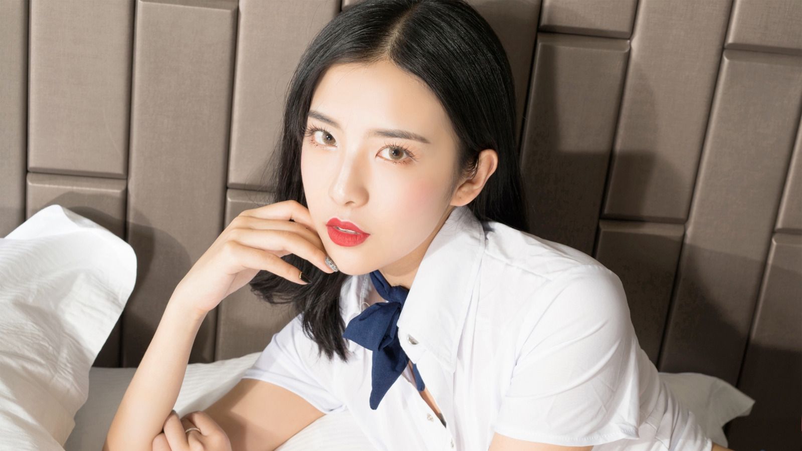 随手挽了个低丸子头,几缕头发随意的垂在耳前,又从包里找了个正红口红抹上。